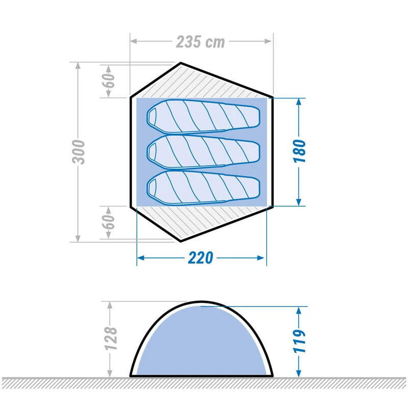 Tente 3 saisons : votre tente vous protégera des conditions météorologiques difficiles que vous rencontreriez au printemps, durant l’été ou en automne. Elle supportera de petites chutes de neige mais n’est pas conçue pour résister à de grosses charges qui pèseraient sur la structure.